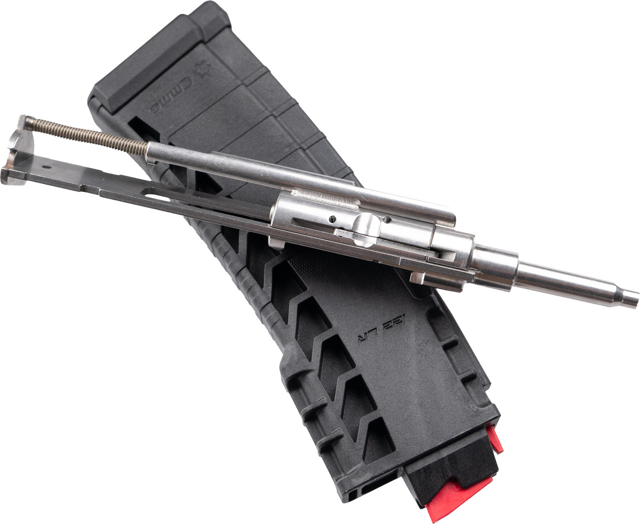 Just swap this drop in conversion with the bolt carrier group from your 5.56/.223 chambered rifle and you will be ready to shoot .22LR. Ships with 25rd 22LR magazine. For best performance use a round style hammer as notched hammers can cause function issues and 36 grain plated nose bullets have proven to be the best choice for function.