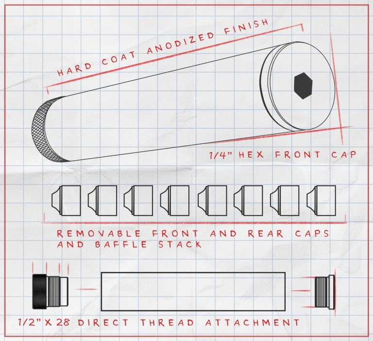 Removable end caps and baffles make user serviceability a cinch for cleanup while baffle indexing marks make for quick reassembly that assures you get optimal sound suppression once it’s reassembled. A hex opening on the front cap allows a 1/4" allen wrench or hex bit to be inserted for easier disassembly in the event any carbon fouls up the threads.