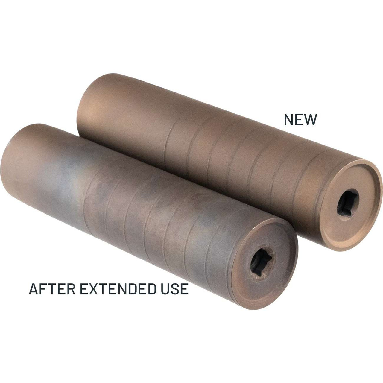 Starting as a smokey bronze color, the raw uncoated stainless steel patinas with use, making each "organic" suppressor unique in its constantly evolving pattern and coloring. Color and patina will change depending on number of rounds shot, caliber, type of firearm, oiling, and handling; Photos shown are not a guarantee of how the suppressor looks will change.