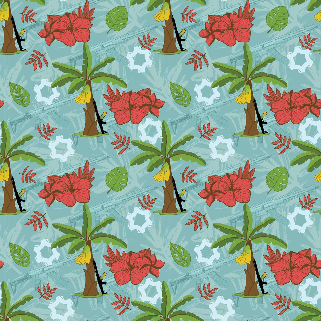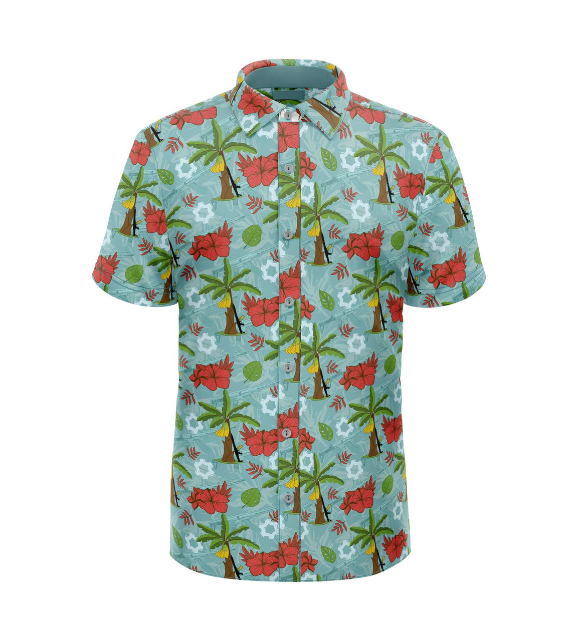 This s*%# is bananas (b-a-n-a-n-a-s)! Whether you are actually chilling out on the beach or just need some of that aloha spirit, this palm tree banana mag hawaiian shirt has it all: Mk47s, banana mags, and tropical vibes for days. Sizes run true to size. 90/10 Polyester/Spandex blend.