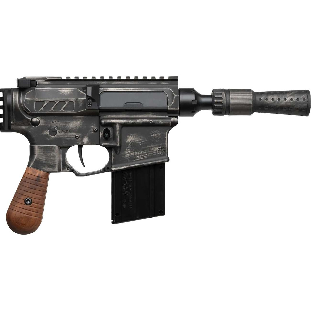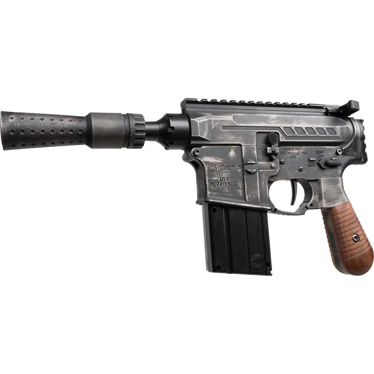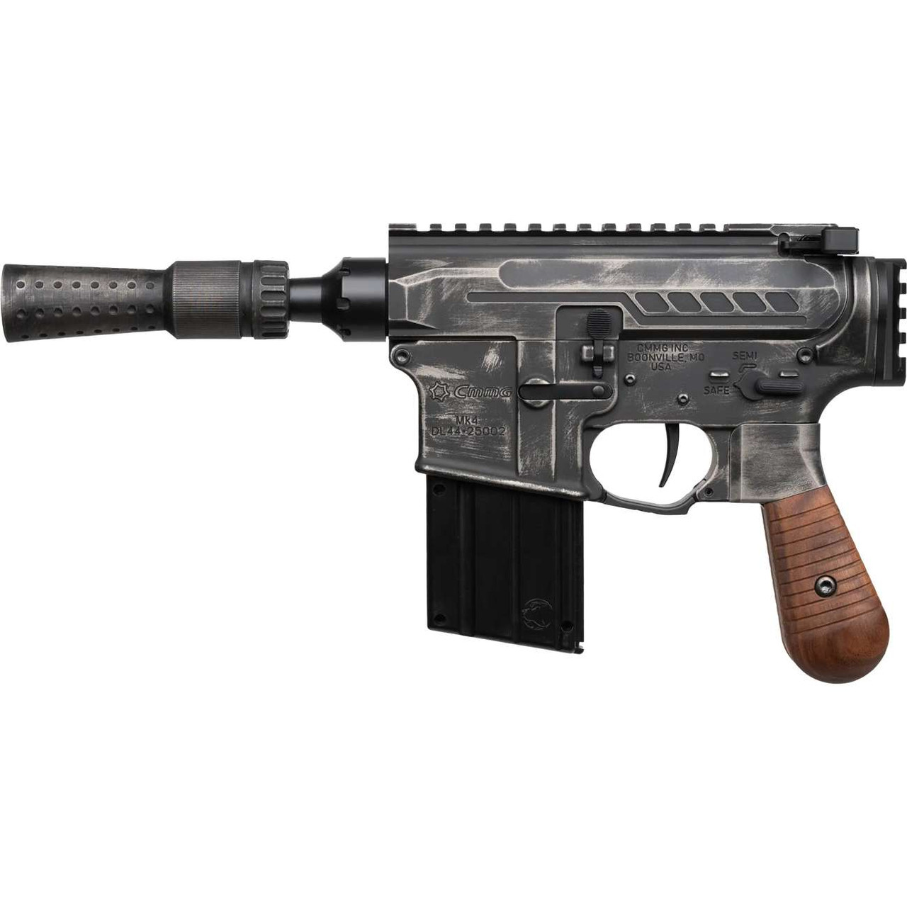 Derived from CMMG’s popular line of .22LR firearms, this pistol mimics the original Solo Blaster but with all the form and function you’ve come to know from a CMMG pistol. The finish is a unique battle worn pattern Cerakote with a matching finish on the DL44 Suppressor. The three piece DL44 pistol grip features an aluminum grip frame with the same battle-worn cerakote and real walnut wood grip panels accenting either side.