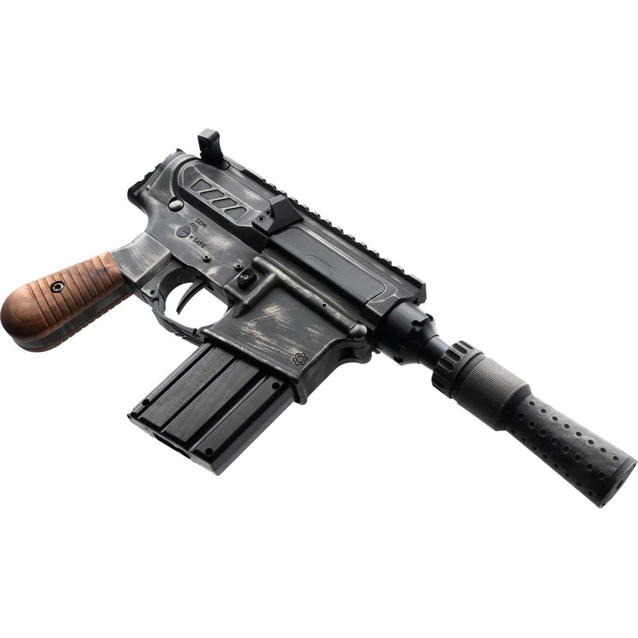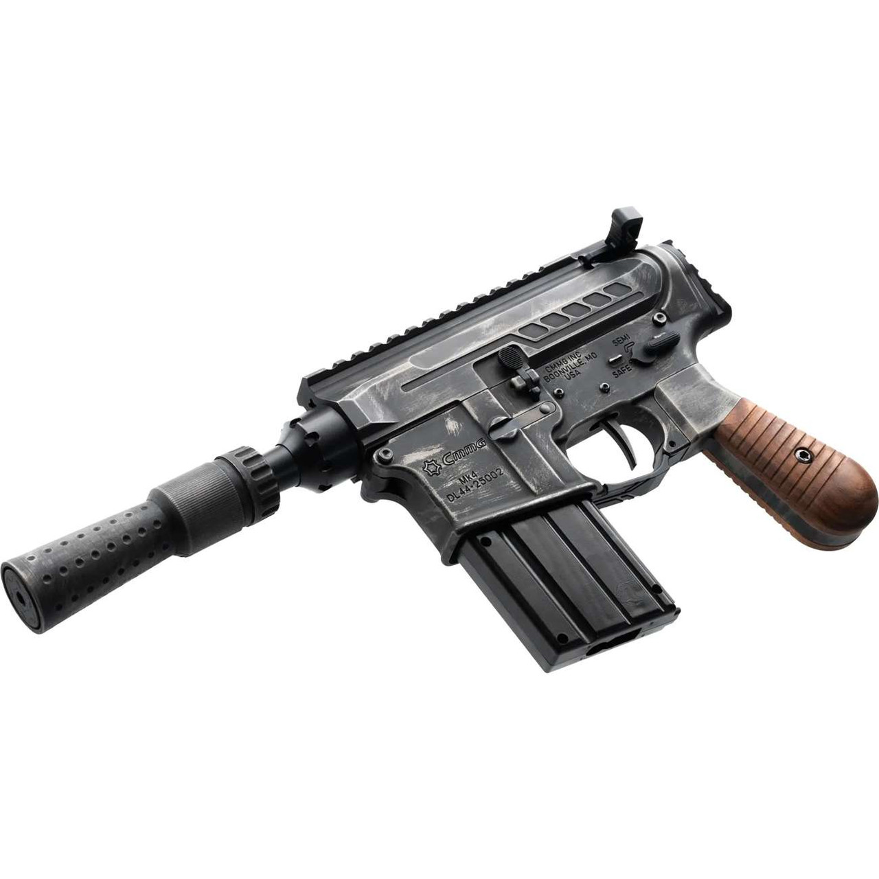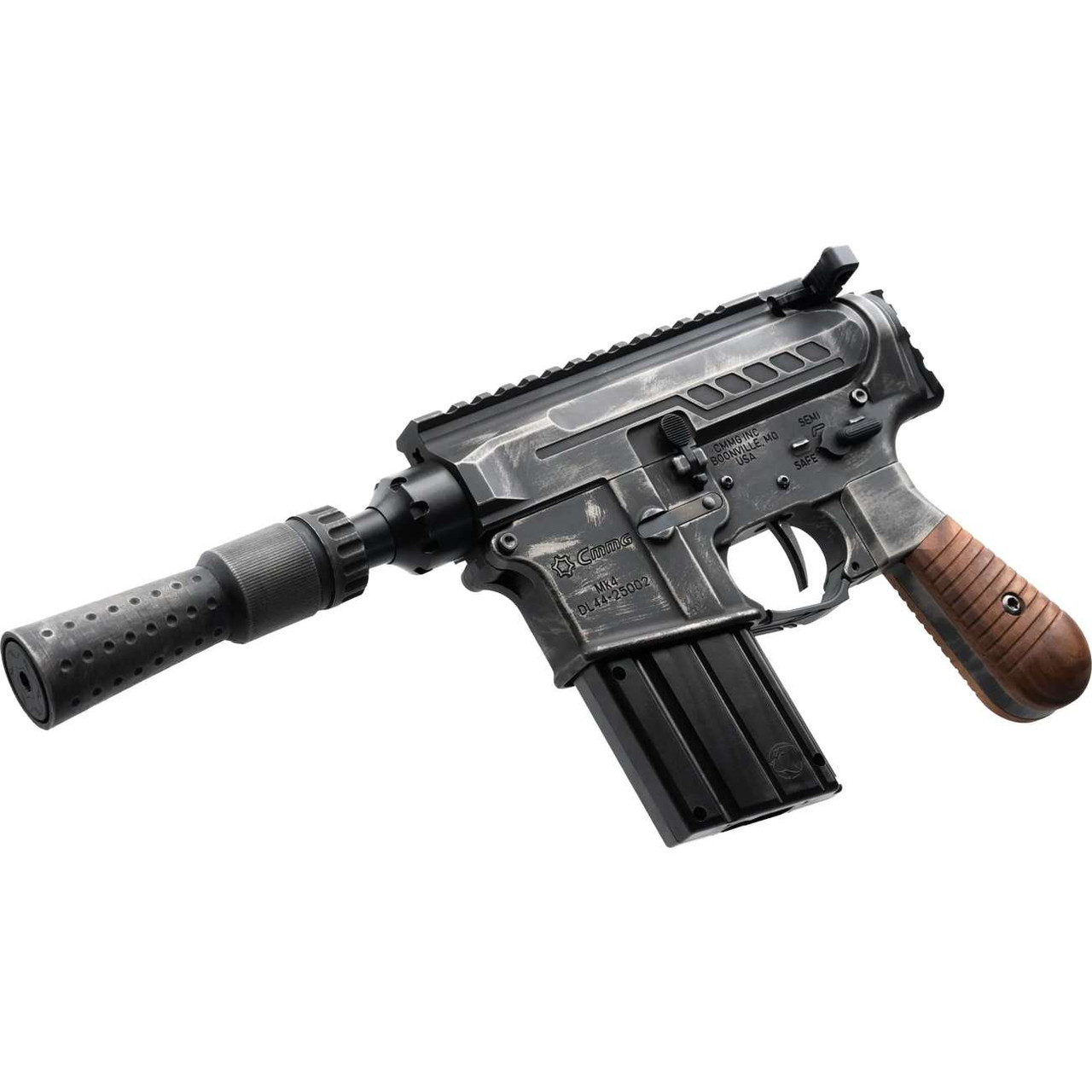 Derived from CMMG’s popular line of .22LR firearms, this pistol mimics the original Solo Blaster but with all the form and function you’ve come to know from a CMMG pistol. The finish is a unique battle worn pattern Cerakote with a matching finish on the DL44 Suppressor. The three piece DL44 pistol grip features an aluminum grip frame with the same battle-worn cerakote and real walnut wood grip panels accenting either side.