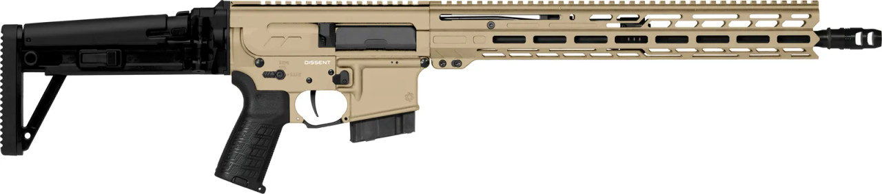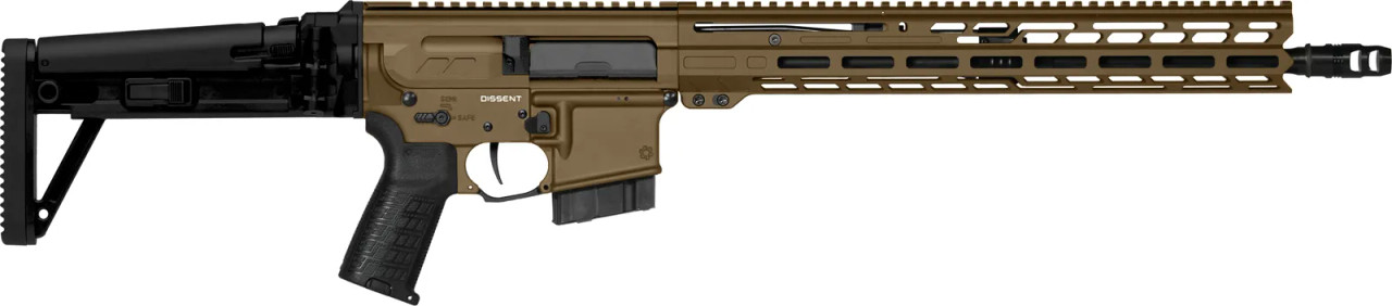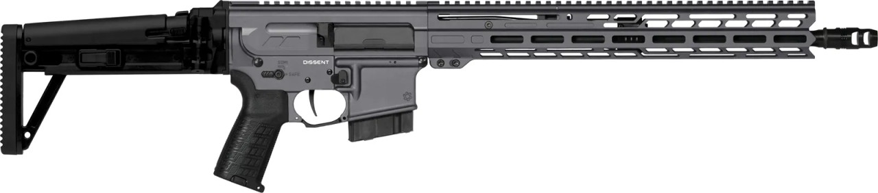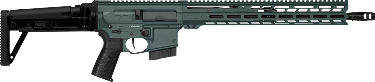 Available in a variety of custom Cerakote finish options; the rear of every DISSENT rifle features the DISSENT side folding stock with adjustable length of pull and adjustable cheek riser. A forward non-reciprocating charging handle allows for quick and easy manipulation without coming off target and the M-LOK handguard with top picatinny rail provides ample mounting space for whatever accessories you please.