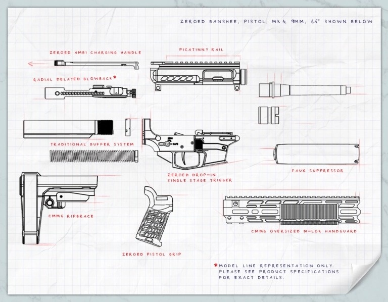 The ZEROED BANSHEE MkG Upper Group includes a ZEROED Faux Suppressor that tucks neatly beneath the oversized, dad bod-ish 11" M-LOK handguard, delivering the formidable look of a suppressed platform without NFA paperwork or suppressor restrictions.