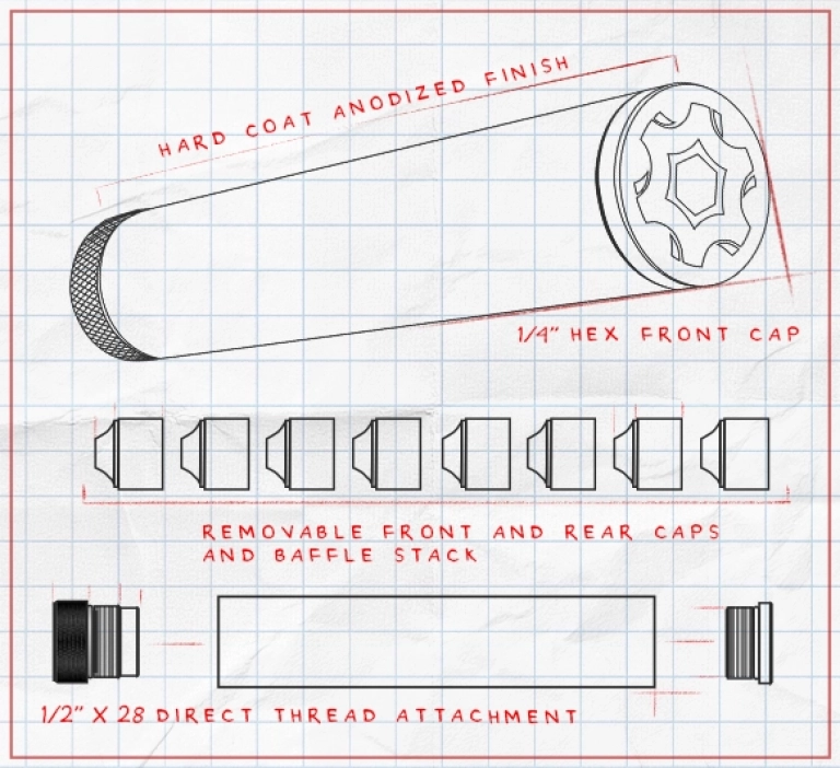 Removable end caps and baffles make user serviceability a cinch for cleanup while baffle indexing marks make for quick reassembly that assures you get optimal sound suppression once it’s reassembled. A hex opening on the front cap allows a 1/4" allen wrench or hex bit to be inserted for easier disassembly in the event any carbon fouls up the threads.